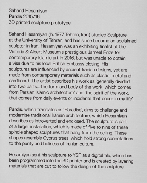 This exhibition has been conducted in partnership with ArtRole, an international arts organisation dedicated to building a cultural bridge between the Middle East and the rest of the world. YSP is very grateful to Adalet Garmiany, Chief Executive and Founder of ArtRole for his continued and genuine collaboration. YSP would also like to thank all of the artists for sharing their artwork, to Emily Riddle for undertaking research, to the Caspian Arts Foundation and Asia House for their support and to GoPrint3D for their kind sponsorship.