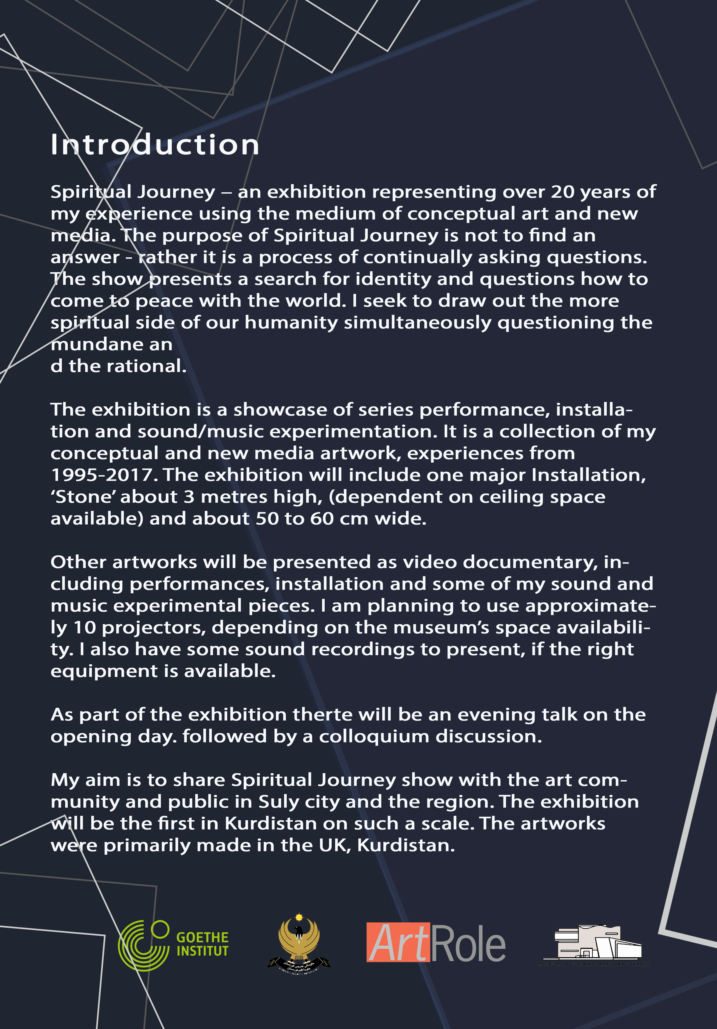 My aim is to share Spiritual Journey show with the art community and public in Suly city and the region. The exhibition will be the first in Kurdistan on such a scale. The artworks were primarily made in the UK, Kurdistan.